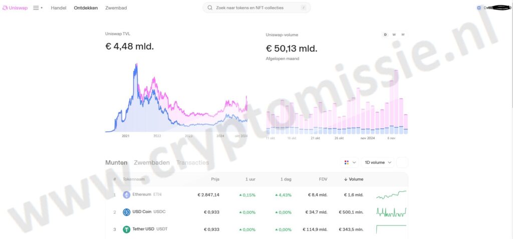UniSwap maakt het makkelijk om cryptogeld te verhandelen. Je hoeft niet in te loggen of een account te maken. Gewoon je wallet verbinden en je kunt beginnen. Let wel op voor scams en spam.