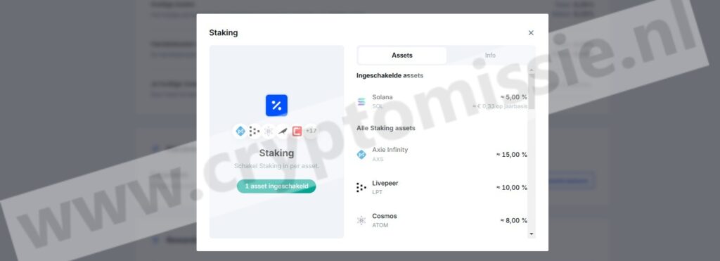 Bitvavo houdt het simpel met staking. Je zet je crypto vast voor een bepaalde tijd. In ruil daarvoor krijg je rente. Zo groeit je bezit vanzelf, zonder dat je er iets voor hoeft te doen.