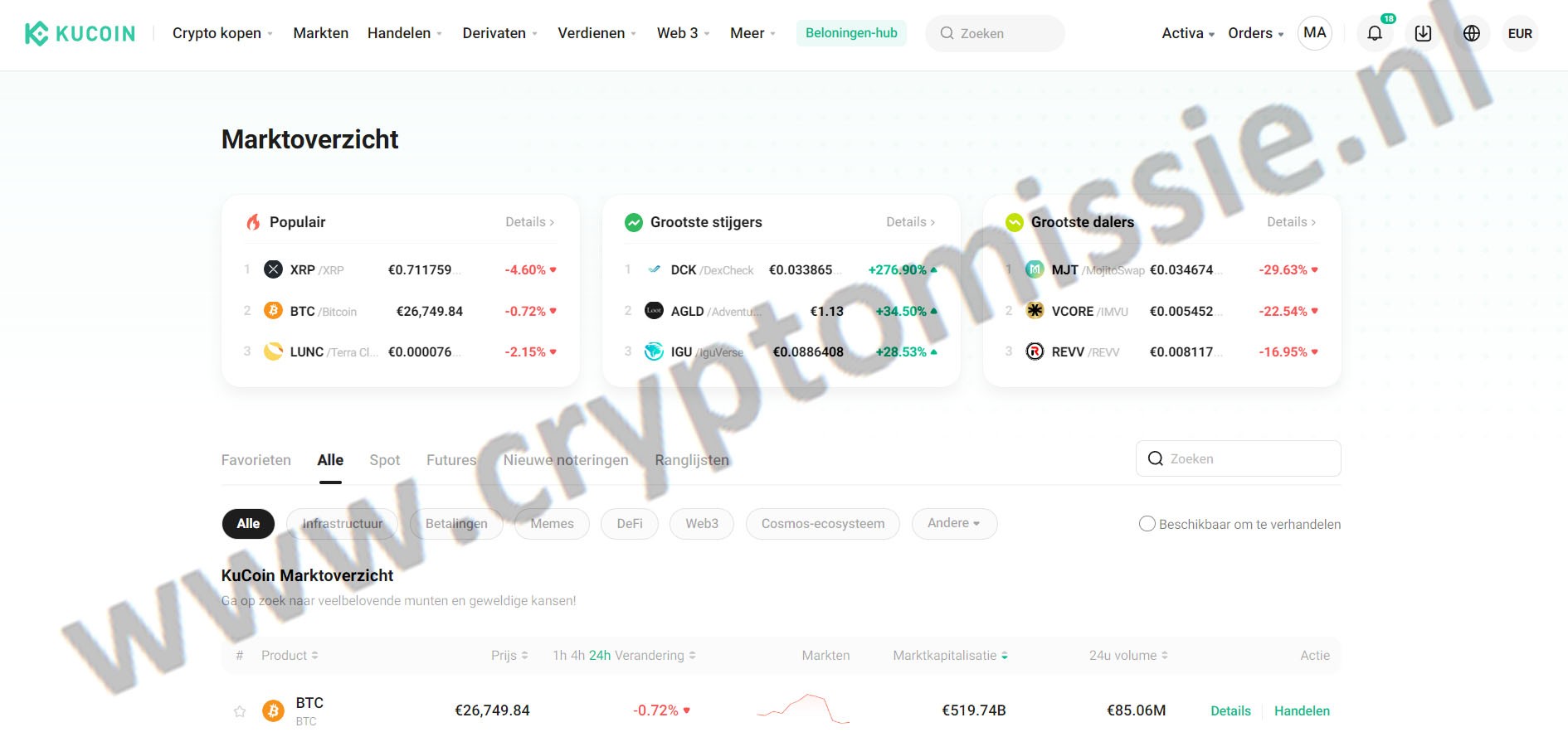 Kucoin is een toonaangevende cryptocurrency exchange die gebruikers de mogelijkheid biedt om een breed scala aan digitale valuta’s te verhandelen. Met een gebruiksvriendelijke Nederlandstalige interface en snelle orderverwerking, is Kucoin een populaire keuze onder handelaren.